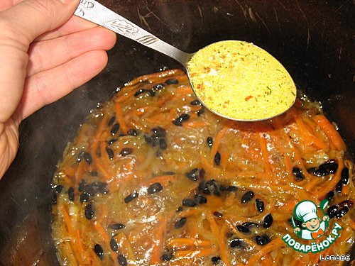Убавить огонь. Из риса сделать горку и накрыть крышкой. Пусть рис готовиться 25-30 минут.