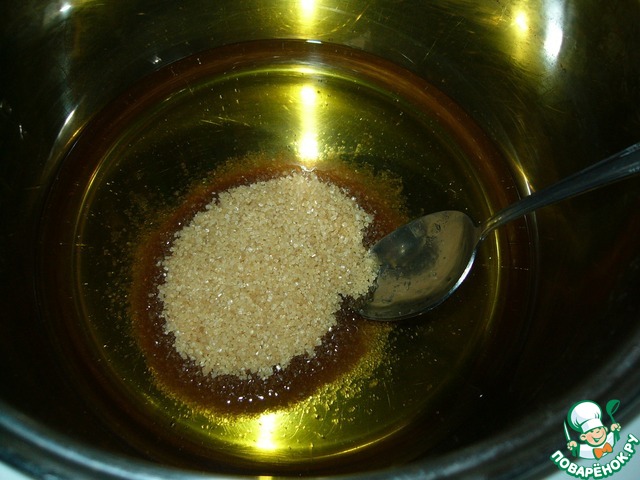 В кастрюлю ( или как у меня, в чашу мультиварки) влить раст. масло, добавить мёд, коричневый сахар.