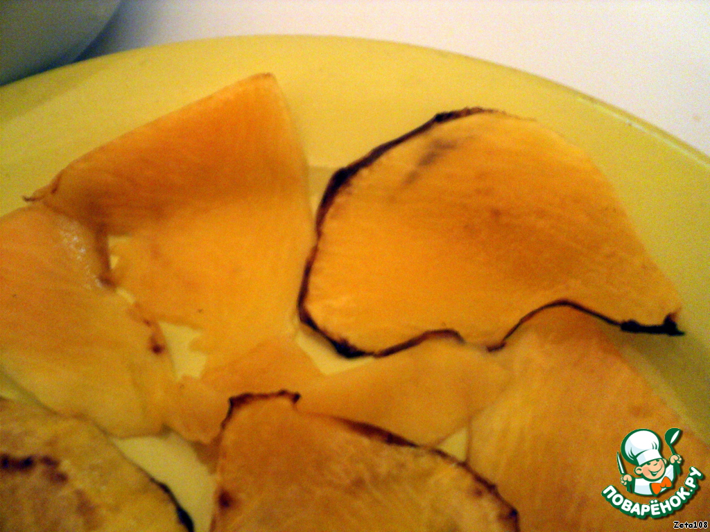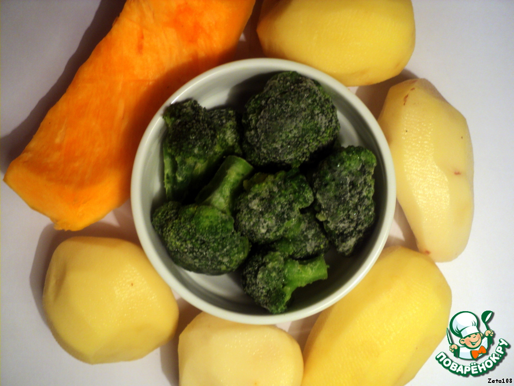 Картофель нарезать на небольшие "брусочки" (для того, чтобы быстрее сварился). Тем временем слегка обжарить тонкие пластинки тыквы, совсем чуть-чуть, чтобы стали мягкими.