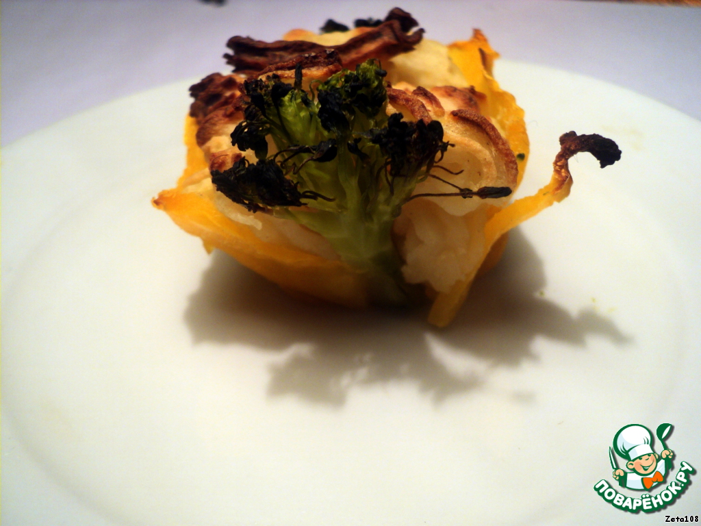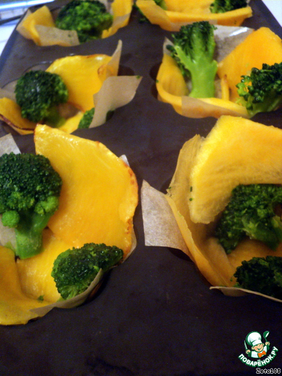 Соцветия брокколи разрезать на две части. Уложить в формочки: листочки пергамента (так удобнее их доставать будет), в серединку каждого будущего кексика положить по пластинке тыквы и с двух противоположных сторон кексика тоже по пластинке тыквы, с других же двух сторон будущих кексов положить половинки брокколи (края прижать).