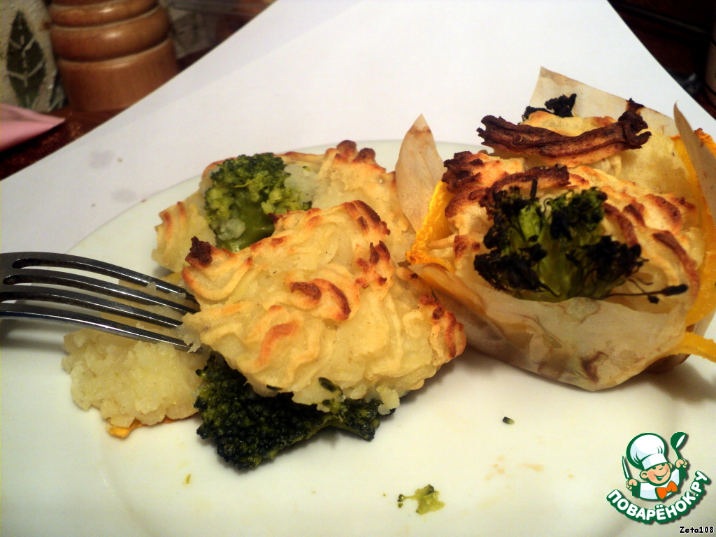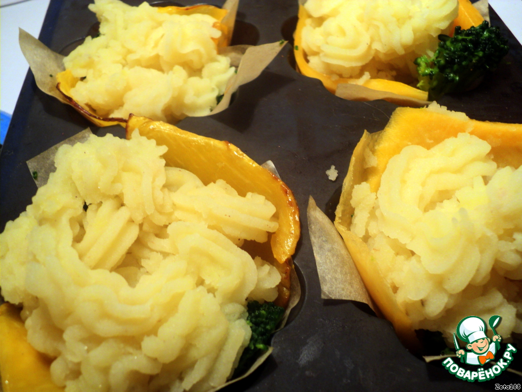 Картофель уже сварился, сделать из него пюре. В каждую получившуюся корзиночку-форму для кекса выложить пюре.