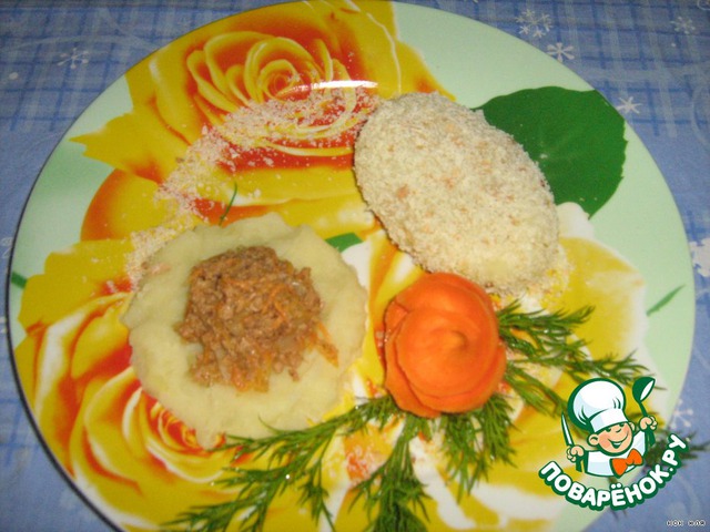 Формуем зразы делаем лепёшки на них укладываем готовый фарш и закрываем придаём продолговатую форму.Панируют в булочной крошке .