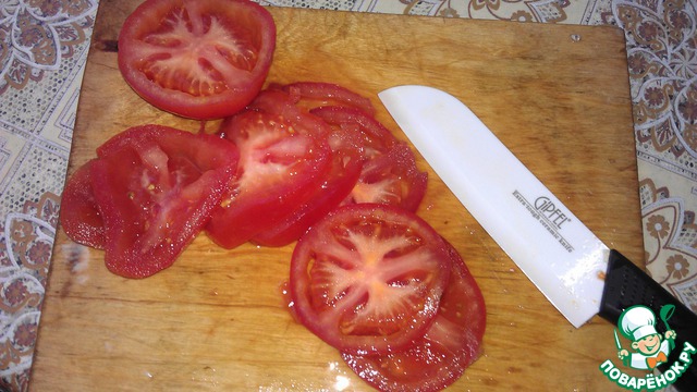 Крупные помидоры нарезаем кружочками. Чем мясистее помидоры - тем вкуснее будет рис. Можно готовить это блюдо и с черри, но мне как-то не хватает тогда помидорного вкуса. :-)