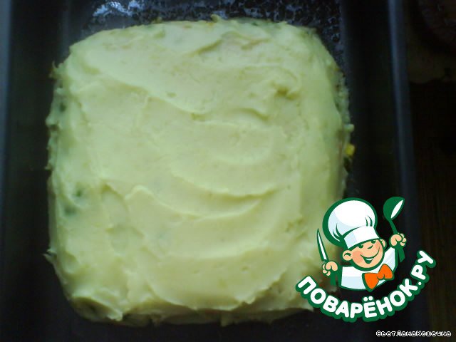потом берем противень и на него выкладываем половину картошечки,на картошечку наши овощи и снова картошку.Все это дело ставим запекаться в духовку минут на 30.