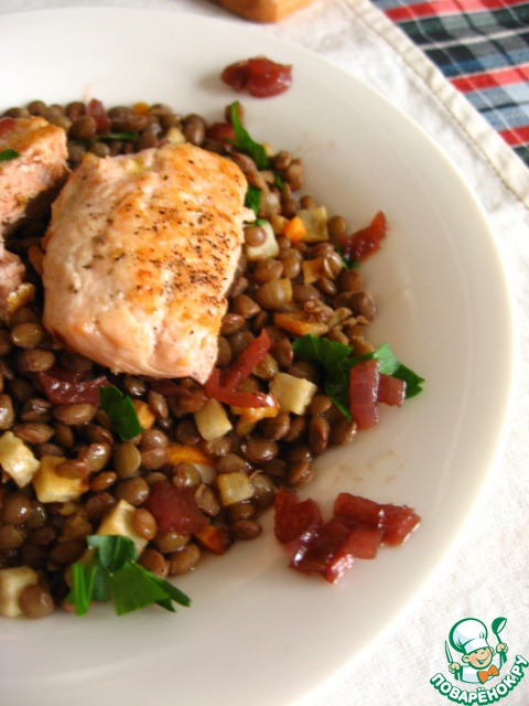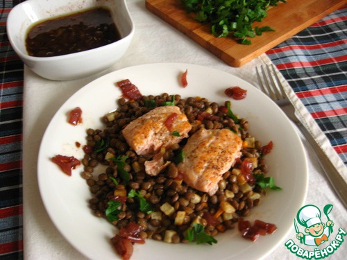 Филе горбуши с чечевицей и карамелизованным луком в красном вине