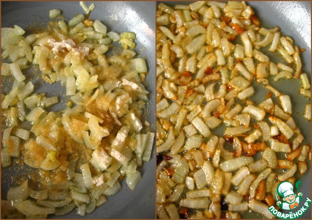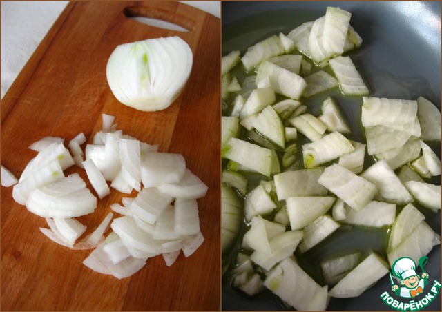 Луковицу очистить, некрупно нарезать и обжарить в 2 ст. л. оливкового масла 2 минуты.