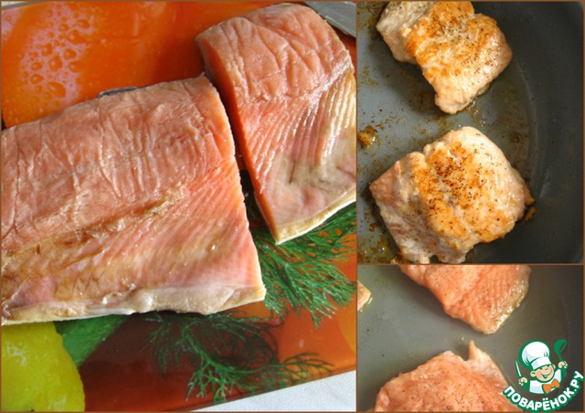 Рыбу можно использовать любую красную: сёмгу, форель, лосось, горбушу, но мне так показалось, что сюда подойдут более суховатые виды; у меня - горбуша.