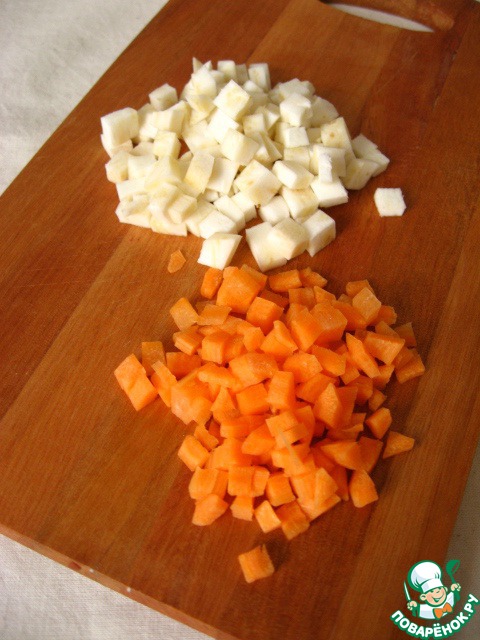 Морковь и сельдерей очистить и нарезать мелкими кубиками.