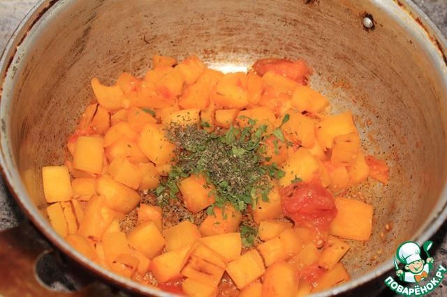 Когда кабачок будет готов уже наполовину, добавить сушеные базилик и сельдерей, томатную пасту (или консервированные томаты). Перемешать.