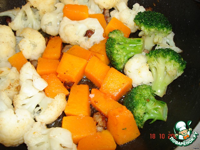 Все обжаривается на небольшом огне, под крышкой. Сначала тыква, затем добавить брокколи и цветную капусту.