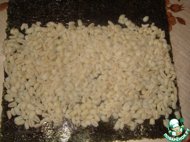 Лист нори положить на стол или на специальный коврик гладкой стороной вниз, выложить 2-3 столовые ложки перловки, смочить руки холодной водой и разровнять