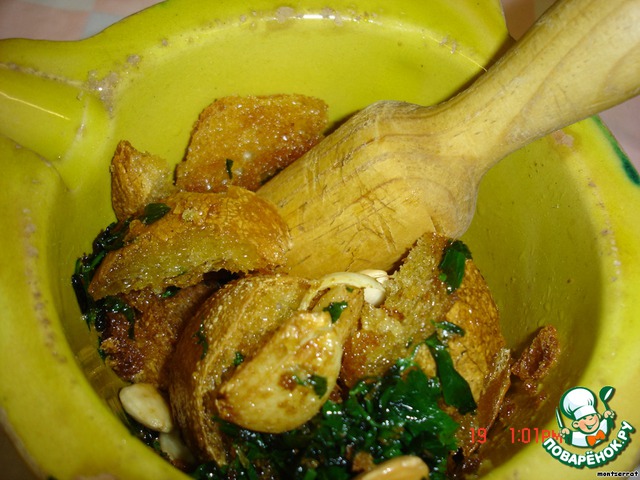 Для улучшения вкуса обжариваем на раст масле черствый хлеб, чеснок, толчем в ступке до однородной массы, разбавляем бульоном и вливаем в кипящий горох.