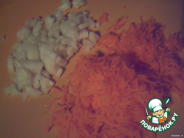 Режем лучок и трем морковочку.