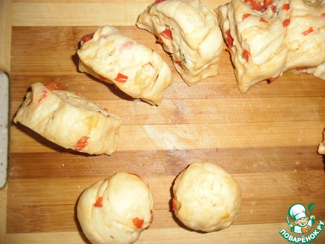 Подошедшее тесто выложить на стол и разделать на маленькие булочки..