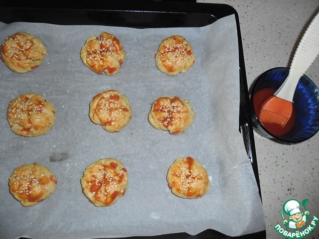 Выложить булочки на противень, покрытой пекарской бумагой. На булочках с верху обратной стороной ножа сделать насечки в виде крестика. Кетчуп развести водой, смазать им булочки и посыпать кунжутом. Дать булочкам подойти, выпекать при 180 гр. 15-20 мин.