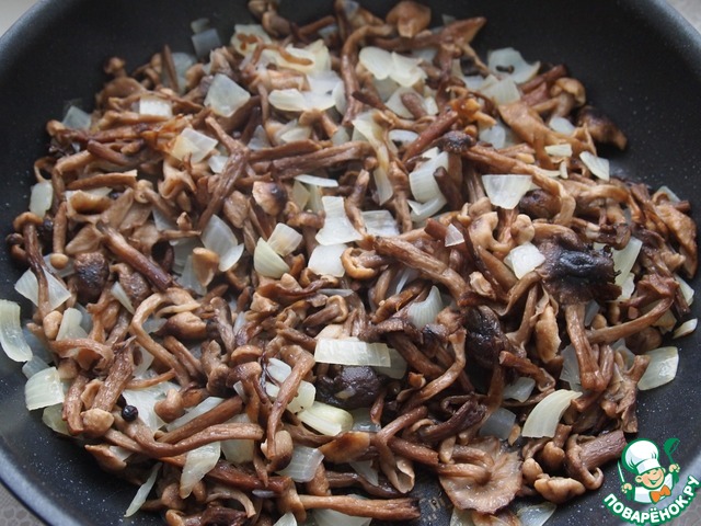 Грибы промыть холодной водой и обжарить в сковороде на растительном масле вместе с луком минут 7.