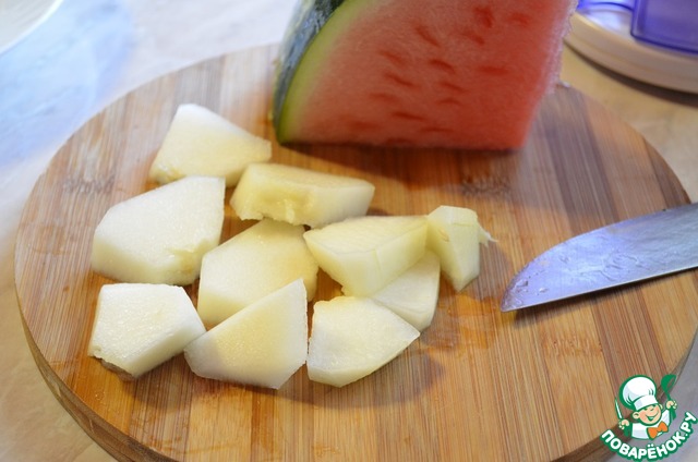 Дыню и арбуз почистить от корки, вынуть косточки и порезать кубиками