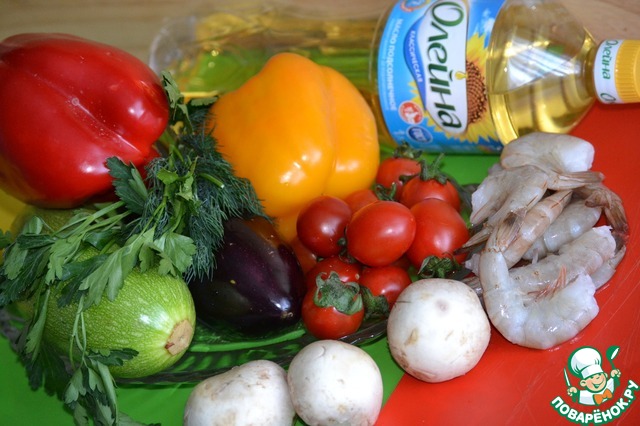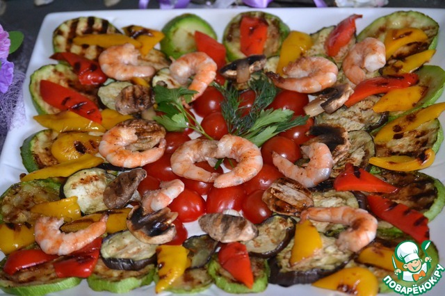 Всё, все наши составляющие готовы! Теперь смело их размещаем на блюде. Я всегда делаю на большом, выкладываю, практически, в один слой, по краям цукини, затем слои баклажан, сверху перчик (его я немного мельче режу после гриля), в центр кладем половинки черри, произвольно сверху грибы и креветки. Сверху ложкой аккуратно распределяем заправку. Заправку готовим из смеси 3 ст. л. масла Олейна, 2 ст. л. соевого соуса, 1 з. чеснока и 1 ст. л. лимонного сока, соль и перчик по вкусу.