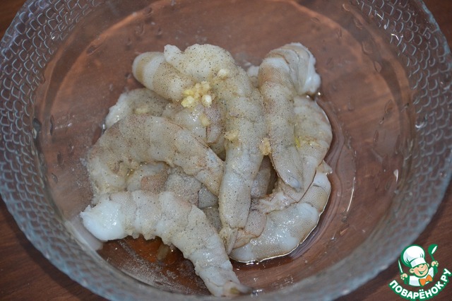Первым делом замаринуем креветки. Маринад делаем следующим образом, смешиваем 1 ст. л масла Олейна с 1 ст. л. соевого соуса и зубчиком чеснока (через пресс), перчик молотый по вкусу. Оставляем наши креветки мариноваться и займемся овощами. Не забываем включит гриль.