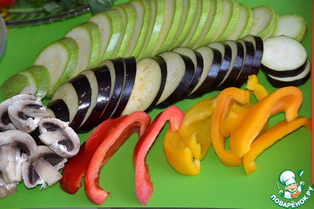 Нарезаем кабачок и баклажан кружочками, толщиной, примерно, 4 мм, перец на полоски.