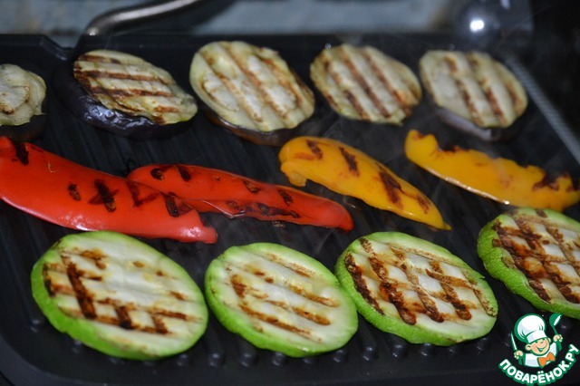 Разогретый гриль смазываем при помощи кисточки маслом Олейна и выкладываем овощи. Постепенно все пережариваем.
