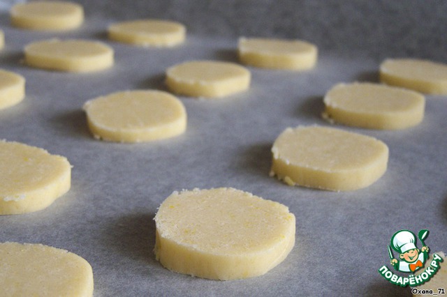 Колбаску нарезать на диски, толщиной примерно 0,5-0,7 мм. Выложить на противень, застеленный пергаментом, на расстоянии 2-3 см друг от друга (печенья практически не увеличатся, так как нет яйца в тесте). Выпекать в заранее разогретой духовке 10-12 минут при температуре 175°С.