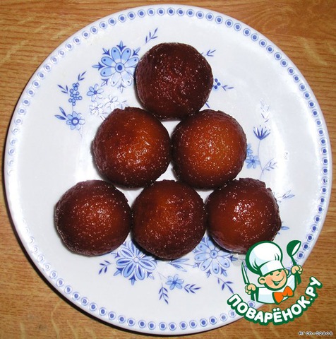 Когда шарики поджарятся до тёмно-коричневого цвета, вытащите их и опустите в сироп. Держите их в сиропе от одного часа до суток.