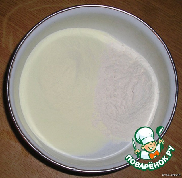 Насыпьте в чашку 1 стакан сухого молока и четверть стакана обычной муки.
