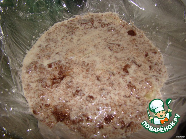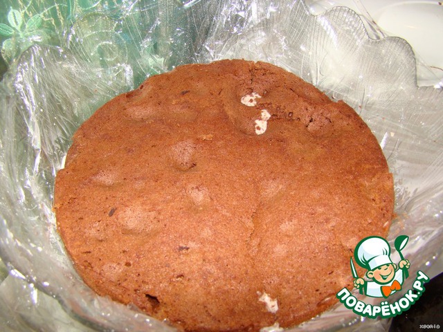 Накроем целым коржом.Завернем в пленку и убираем в холодильник до полного застывания(Не менее чем на 4 часа)