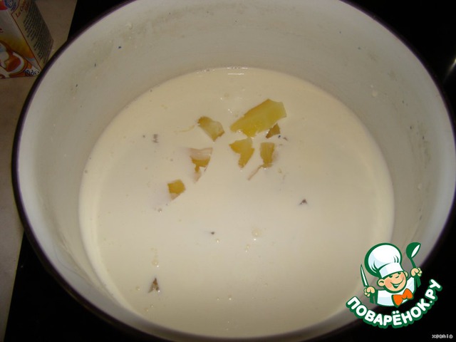 Желатин замочим в воде.(Если у вас не листовой а обычный желатин .Возьмите побольше .15 грамм думаю будет достаточно)Оставшиеся кольца ананасов порежем .Добавим в сливки .Туда же добавляем сок ананаса .Нагреваем сливки доводим почти до кипения но не кипятим.Растворяем в них желатин