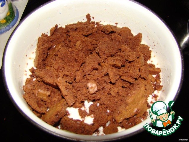 Разрежем готовый корж вдоль.Получаем 2 коржа .Один сохраним целым второй раскрошим в сливочный крем