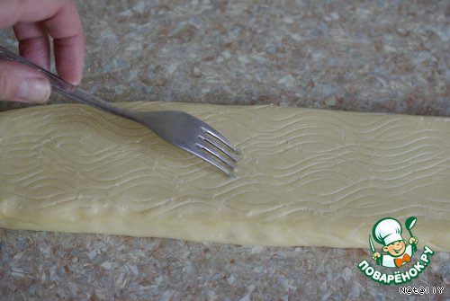 Смазываем его взбитым яйцом и наносим узор вилкой, смачивая ее в этом же яйце.