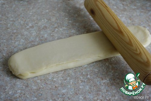 Затем по длине рулета прокатываем скалкой, аккуратно вытягивая и прикатывая его до толщины 1.5 см.