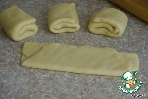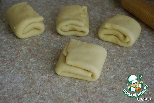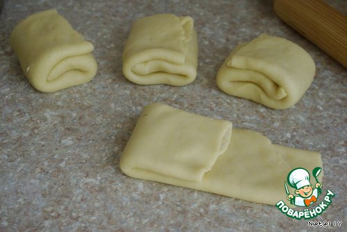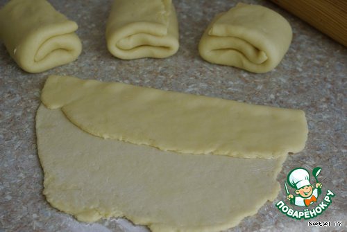 Убираем наши кусочки в холодильник на 2 часа. Затем, не разворачивая, раскатываем и еще раз смазываем тонким слоем сливочного масла. И снова на 2 часа в холод.