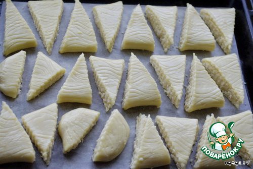 Режем тесто волнистым ножом так, чтобы у треугольничков "клювики" были разрезаны. При выпекании они должны раскрыться.