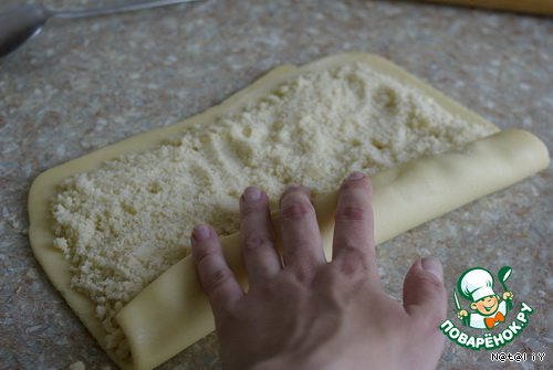 Раскатываем по очереди наши кусочки и выкладываем на него начинку. Начинку распределить по поверхности теста и прижать ее, так удобнее сворачивать рулетик.