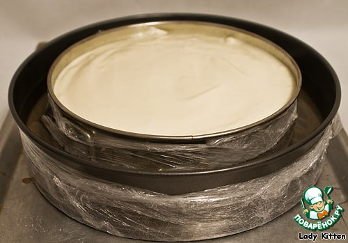 Если у вас формы, как у меня разъемные, то их нужно обернуть пищевой пленкой (это нужно для того, чтобы вода не попала в тесто и не вытекала из формы).
