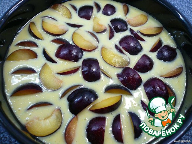 Вылить большую часть теста в форму или на лист. Сверху выложить фрукты.