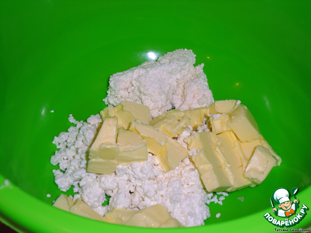 Размягченное сливочное масло смешать с творогом и просеянной мукой. Замесить тесто.