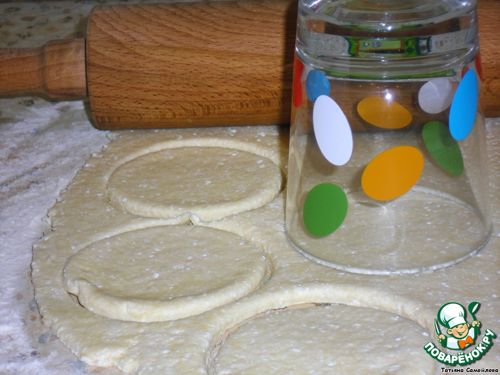 Раскатать тесто в пласт, вырезать стаканом кружки.