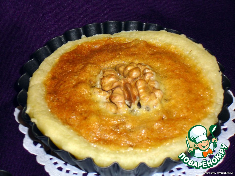 Заливаем яичной смесью. Раскладываем красивые половинки орехов. Отправляем в разогретую на 180 градусов духовку на 20 минут.