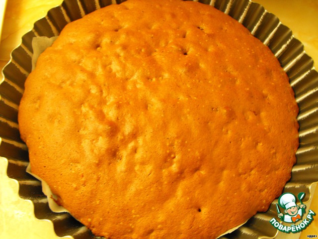 Разрезать корж на 2-3 части. Корж получается довольно плотным и очень легко разрезается.