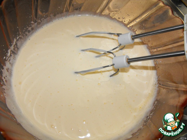 Яйца взбить миксером с сахаром до образования высокой пены.