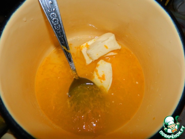 Соединяем масло, цедру, 100 мл апельсинового сока, лимонный сок и сахар. Нагреваем.
