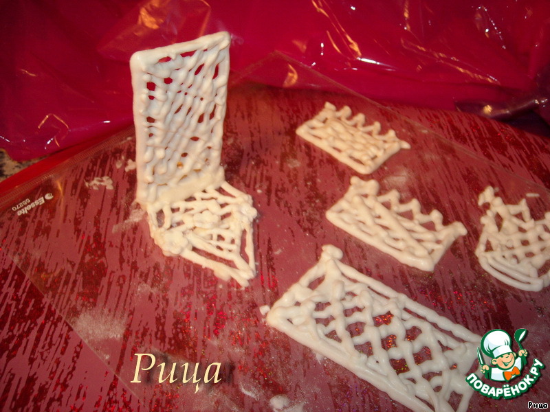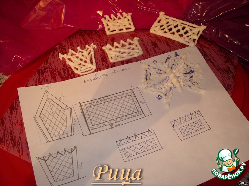 1 -ое , отделяем белок от желтка и осторожно взбиваем венчиком, постепенно подсыпая просеянную сахарную пудру, пока она не примет белую однородную массу с не очень выраженными пиками. Можно взбивать и миксером, но только на самых минимальных оборотах, чтобы масса не насыщалась воздухом, который не даст тонкой линии при нанесении рисунка. Так что наберитесь терпения в этом процессе. Готовую глазурь необходимо укрыть плeнкой или, даже, двойной, сверху положить влажное полотенце, это убережeт нашу глазурь от высыхания в процессе работы. Глазурь в корнетик наполняем до половины, так она лучше отсаживается на рисунок. По мере расходования наполняем вновь. Когда у меня остаeтся какое-то количество лишней глазури, я уже сама от руки рисую какие-то маленькие узоры на шаблоне (у меня бабочка видна на фото) и использую таким образом все остатки. Они всегда пригодятся в будущем для украшения тортов или кексов. Сама работа с рисунками айсингом много времени не занимает - всего около 30 минут. Сушка изделий - это то, на что уходят сутки.. И если даже хорошо просушится та или иная часть, а какая-нибудь может повредиться при снятии уже готового рисунка с айсингом и при этом не очень приятным факте приходится повторять всe заново - вот это самое главное, что необходимо иметь ввиду, если Вы пожелаете делать Колыбельку или какое другое объeмное изделие к определeнному сроку, то лучше этой работой заняться за неделю до торжества, чтобы иметь запас времени на случай поломки деталек. Конечно, здорово, если всe сразу получится как следует.