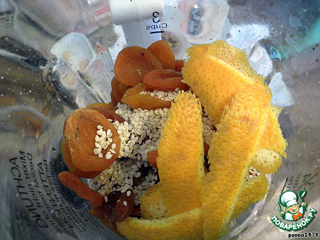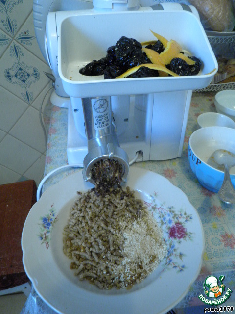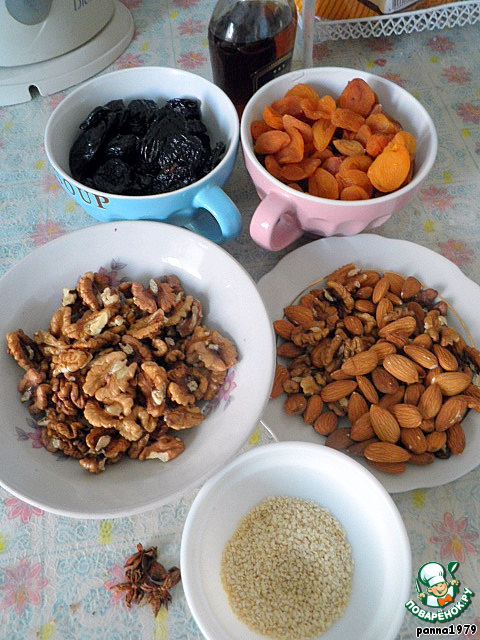 Я решила соединить пары чернослив-грецкий орех и курага-миндаль с небольшим количеством грецких орехов. Соединяем чернослив (курагу) с орехами, кунжутом, бадьяном, цедрой апельсина и коньяком.