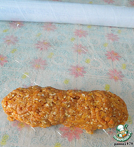 Выкладываем массу на пищевую пленку и туго сворачиваем, формируя колбаску. Стараемся как можно плотнее утрамбовать массу, от этого зависит, насколько хорошо будет держать форму готовая колбаса.