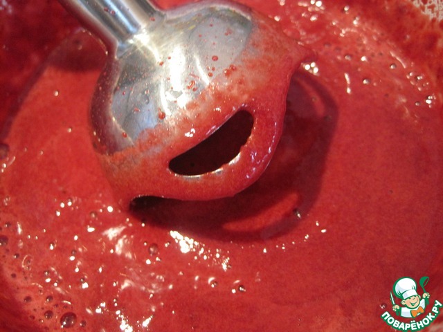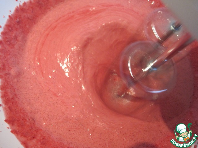 Дальше у меня всё происходило быстро, поэтому фото делала буквально одной левой :) правой непрерывно взбивала массу. Поэтому прошу прощения за качество фотографий. В остывшее вишнёвое пюре добавляем половину белка и взбиваем массу до посветления и увеличения её в объёме (1-2 минуты)
