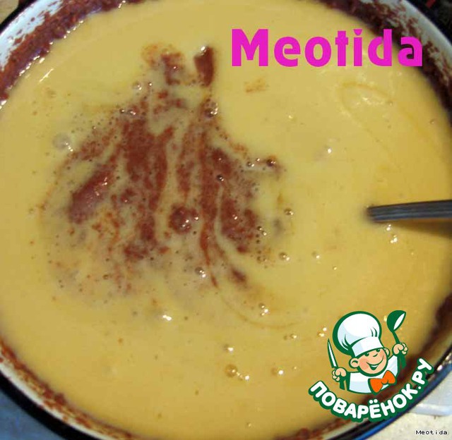 затем выливаем остальное молоко (всего 2 стакана)и ставим на "водяную баню", доводим почти до кипения