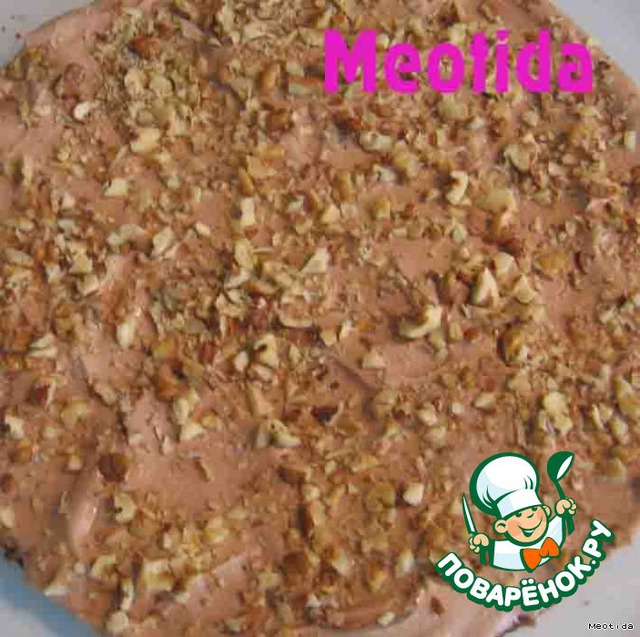 на блюдо выкладываем первый корж, смазываем кремом, посыпаем орешками